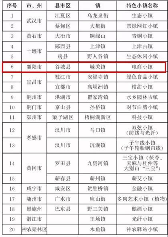 咸宁市嘉鱼县官桥镇、黄冈市红安县七里坪镇、荆门市东宝区漳河镇、潜江市熊口镇、宜昌市兴山县昭君镇、神农架林区红坪镇、荆州市松滋市洈水镇、襄阳市老河口市仙人渡镇、恩施州利川市谋道镇、十堰市竹溪县汇湾镇、随州市随县长岗镇、天门市岳口镇、武汉市蔡甸区玉贤镇、仙桃市彭场镇、襄阳市枣阳市吴店镇、宜昌市夷陵区龙泉镇