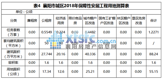 襄阳市城区2018年国有建设用地计划供应总量为1130.88公顷。其中商服用地为148.02公顷,住宅用地为219.31公顷(其中保障性安居工程用地55.15公顷,商品房用地164.16公顷),工矿仓储用地为250.80公顷,公共管理与公共服务用地为216.96公顷,交通运输用地为222.65公顷,水域及水利设施用地为73.14公顷,特殊用地为0.00公顷。
