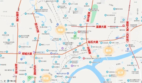 邓城大道作为“北拓”的门户大道,区位日趋明显。邓城大道向东延伸至钻石大道,与富康大道、交通路、园林大道、襄阳大道交汇,通向襄州、东津等区域。向西连接万洲大道与内环西路、汉江路、长虹路、春园路等多条城市主干道连接,通向樊城、牛首等区域,邓城大道贯穿城市东西,一线串起樊城、襄州、高新区。