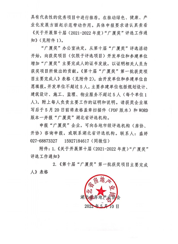 “广厦奖”办公室决定,从第十届“广厦奖”评选活动开始,向获奖项目(仅限于评选项目)开发单位和参建单位增加“广厦奖”主要完成人的证书发放,以证明相关人员为获奖项目所做出的贡献。《第十届“广厦奖”第一批获奖项目主要完成人》表格(见附件2),由开发单位和参建单位自愿填报。开发单位不超过5人,主要参建单位包括规划设计、建筑设计、施工、监理、物业服务不超过5人(每个单位1 人),附上每人负责主要工作的证明和说明。请获奖企业填写后于5月20日前将表格盖章扫描件(PDF版本)和WORD 版本一并报“广厦奖”湖北省评选机构。