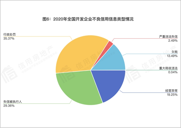 从2020年开发企业的不良信用信息总体情况来看,主要分为6种情形,其中行政处罚的类型占比最高,达到35.37%,其次是失信被执行人、经营异常、欠税、严重违法失信和重大税收违法。