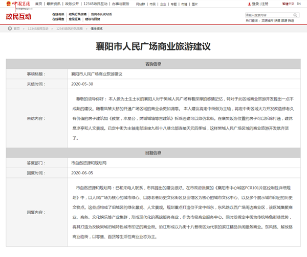 襄阳市自然资源和规划局回复表示:在先前市政府批复的《襄阳市中心城区FC0101片区控制性详细规划》中,以人民广场为核心的城市绿心、以陈老巷历史文化街区及会馆区为核心的城市文化中心、以及多个展示城市印记的历史文物点,构成了旧城区的绿化景观、人文景观。规划重点打造位于定中街东,东风路以西的广场周边商业区,该区域集聚商业、商务、文化娱乐等产业集群,形成现代化的高端服务商业,作为市级商业服务中心。同时发挥定中街为传统特色街巷优势,将其打造为反映樊城旧城特色城市印记的商业街;沿江形成以九街十八巷街区为代表的滨江精品休闲服务商业;东风路、解放路商业临街,以零售、百货等生活性商业业态为主。