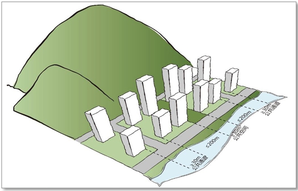 滨水临山区布局宜开敞、通透,提供适当的视线通廊以避免山水景观被连续展开的建筑物所遮挡,地块宽度大于200米的必须设置不小于30米的视线通廊。
