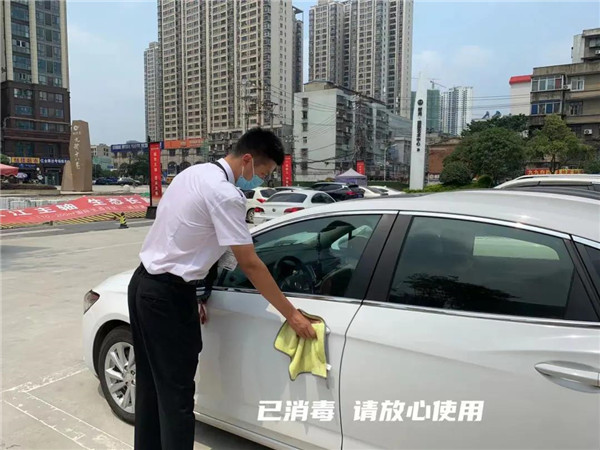 现场保安人员,佩戴好口罩与手套,礼遇每一位到访客户,为客户车门把手消毒,贴心守护每个细节。