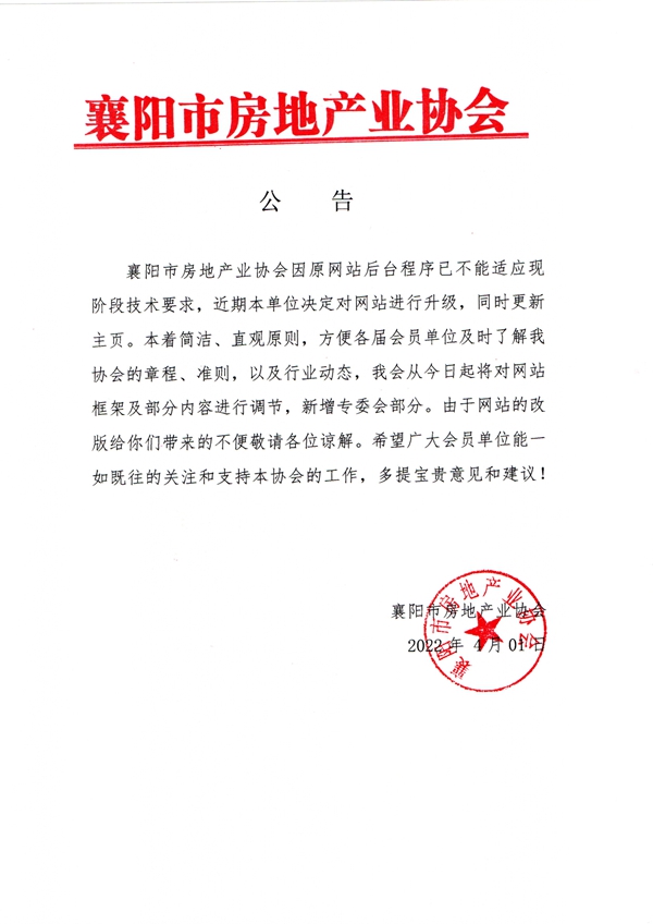 关于襄阳房地产业协会网站(襄阳房地产信息网)整改的公告