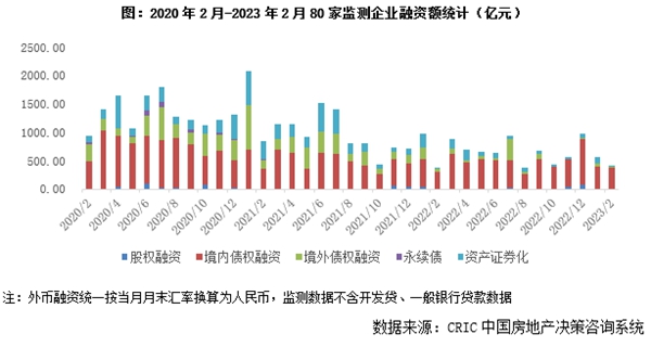 从房企融资情况来看,虽然当前优质房企及白名单房企融资开闸,但行业面融资仍未有全面回暖。2月80家典型房企的融资总量为424.73亿元,环比减少24.1%,同比增加9.5%。前2月累计融资总量为1084.32亿元,同比减少20.38%,融资规模仍处于筑底阶段。